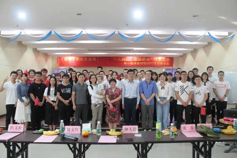 时值金秋,恰逢中华人民共和国成立七十周年,为了进一步深入开展“不忘初心、牢记使命”主题教育,做好入党积极分子培养教育,强化党员入党后的再教育,yl23455永利官网2017本科党支部于2019年11月10日举办了《白衣下的红色温情》——“不忘初心、牢记使命”红色汇演活动,通过歌舞、朗诵等形式多样的表演方式,带领党员、入党积极分子们一起重温初心使命,也给了同学们一个表达自己拳拳之心、展现爱国之情的舞台。此次汇演在大学三元里校区教工饭堂四楼活动中心举行,学院学生党总支钟天送、刘文红老师,学院学工办何丽、张晋、陈文桂老师以及yl23455永利官网各班的党员、入党积极分子参加了此次活动。