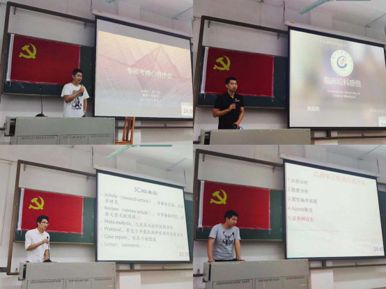 本次交流会由宣传委员洪海都主持,由4位硕士、博士党员代表分别围绕临床、科研、考博三个方面进行心得分享。在活动开场发言中,研究生辅导员杨穗嘉老师向参加的同学们传达了活动开展的背景,肯定了本次交流会举办的积极意义,同时她还鼓励在座的非党员学生积极向党组织靠拢;随后,主持人洪海都同志讲述了本次活动的筹备过程,并对四位主讲人进行了介绍,本次交流会立足学院中医学临床专业的具体实际,围绕与同学们密切相关的重点难点问题,从临床、科研、考博等三个方面为同学们进行答疑解惑。
