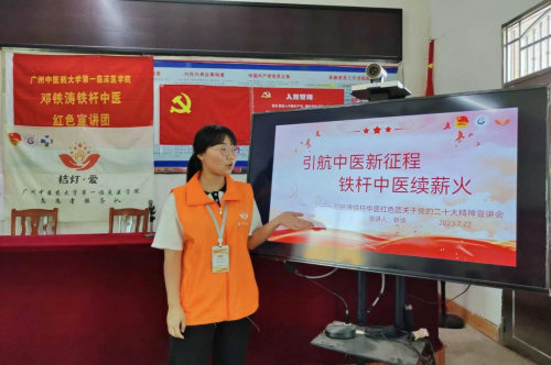 【一院讯】为深入学习贯彻习近平新时代中国特色社会主义思想和习近平总书记对中医药发展工作作出的“传承精华,守正创新”的重要指示,并将主题教育学习成果转化为助力中医药发展的生动实践,yl23455永利官网邓铁涛铁杆中医红色宣讲团的青年们不忘“中医人”的使命,不忘习总书记对当代青年的希冀,将红色故事与专业知识相结合,于2023年7月-8月暑假期间为各地人民群众开展铁杆中医红色文化主题宣讲,切实做到“弘扬国粹为己任,赓续血脉砥砺行”。而今年也是邓铁涛铁杆中医红色宣讲团开展暑期下乡宣讲的第三年。三年如一日,宣讲团成员们始终牢记初心使命,在传承红色精神基因、传播优秀中医药文化的道路上行而不辍,履践致远!