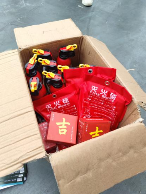(党支部与“福铃”队代表向当地村委赠送消防器材)