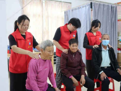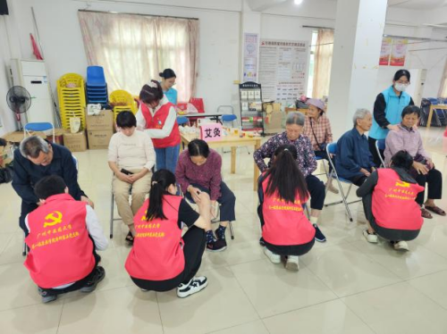 (学生党员志愿者为群众提供艾灸、推拿等中医特色基础医疗服务)
