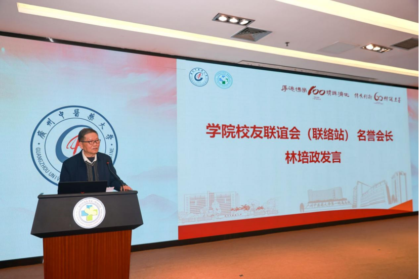 而后是学院优秀校友代表发言。第一位发言的校友代表、学院校友联谊会理事代表陈梓欣老师发言,她通过回忆从踏入校园逐渐转变成为拥有“厚德博学,精诚济世”校训精神的广中医人,再到目前在中医药科研岗位上发光发热的成长历程。她提到了学院校友联谊会既为校友们提供优秀的交流合作机会,又是一院“精诚”文化传承创新的精神纽带,希望能积极举办丰富内涵的活动更好服务校友、反哺母校、回馈社会。第二位发言的校友代表、学院校友联谊会名誉会长林培政教授发言,他以自己的学习经历开篇,为我们呈现了一位优秀中医人的勤奋好学的求学之路,他还分享了自己在毕生研究中所得出对温病的感悟,提出了要为中医发展理论、发展学术,同时要对中医药、中西医结合治疗疾病充满信心。第三位发言的校友代表、学院校友联谊会顾问、国医大师周岱翰教授发言,周老首先回顾了自己在广中医的求学岁月,他领略到中医的博大精深,也体验到临床的酸甜苦辣,深深感受到中医的魅力,也坚定了他从事中医事业的决心。之后,周岱翰教授表明了自己对中医肿瘤事业发展的殷切希望。他认为学院和校友联谊会是联系校友感情的纽带,更是推动校友事业发展的桥梁,校友们要共同为大学和医院的发展贡献自己的一份力量。