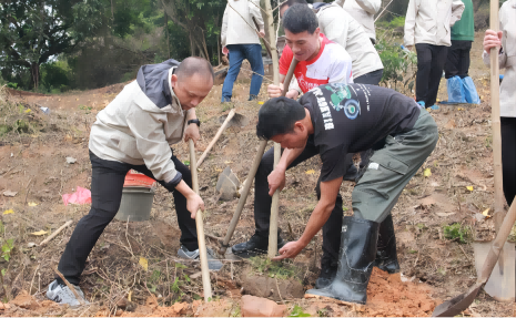 在工作人员讲解植树的技巧和方法后,师生们和当地村民手持铁锹、水桶等工具,分工合作,有的挖坑、有的培土、有的浇水,每个人都为这片土地增添一抹绿色献上了自己的一份力量。植树过程中,大家不仅感受到了劳动的快乐,也体会到了团队合作的力量。经过数十分钟的辛勤劳动,数十棵小树苗在佛冈的土地上扎根生长,为这片土地增添了新的生机与活力。小树苗的种植不仅美化了佛冈水头镇的生态环境,更是进一步深化了广中医一院和佛冈县水头镇帮扶的情谊。
