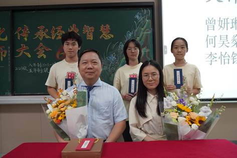 随后,全体同学在赵京涛主任的带领下齐声朗读《大医精诚》片段,同学们的诵读铿锵有力,展现出中医人“精诚”为本、济世救人的高尚品德。随着朗读声落,万众瞩目中,迎来了本次拜师大会的重要环节——拜师仪式。在礼仪队员的引导下,各位导师依次上台就座,学子们手捧鲜花,携带拜师礼及拜师帖,行以庄重的拜师礼,表达自身对于各自导师的诚挚敬意。导师们赠以回徒帖,亲切点头致意,师生在镜头前定格下了这一意义非凡的时刻。拜师仪式结束后,各位老师向学生代表们赠送载有邓铁涛教授思想的相关书籍,勉励大家学习铁杆中医精神。
