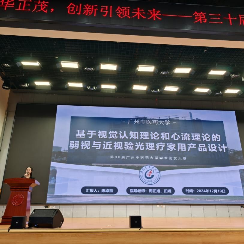 此次决赛以“百年风华正茂,创新引领未来”为主题,决赛分为作品展示和论文答辩两个环节,各参赛队伍充分展示了他们的研究成果和创新思维,智慧的火花在会议厅内不断碰撞,点燃了每一位观众的热情。经过激烈的答辩和评审,最终,我院的科技发明制作类学术论文《基于视觉认知理论和心流理论的弱视与近视验光理疗家用产品设计》凭借其独特的研究视角和创新性设计,从众多作品中脱颖而出,斩获特等奖。该论文的指导老师周正旭、田妮以及团队成员陈卓蓝、邱圣煜、唐翎双、黄慧品、夏智健和方伟键为此付出了辛勤和努力,他们的研究成果不仅为弱视与近视患者提供了更加便捷、高效的验光理疗方案,也为家用医疗产品的发展注入了新的活力。