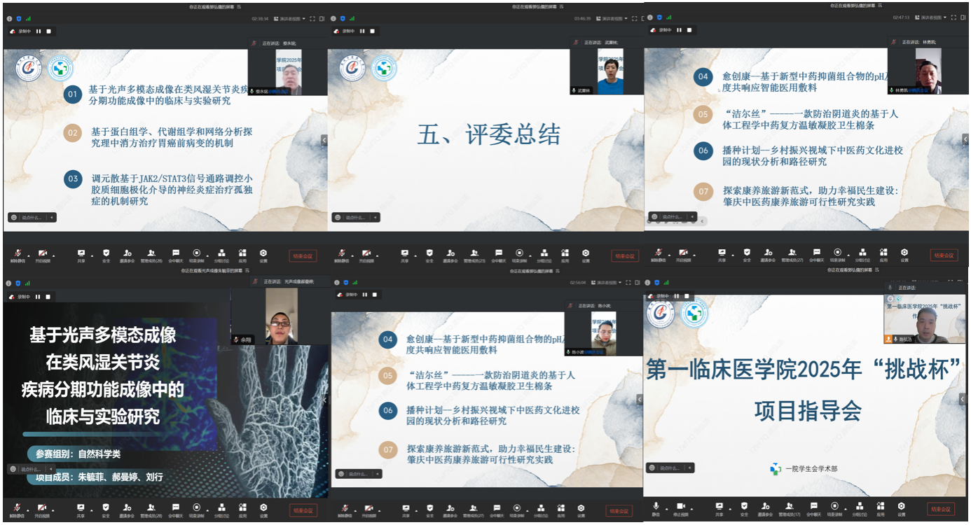2025年2月7日,yl23455永利官网线上举办2025年“挑战杯”项目指导会。活动汇聚了七支医学青年科研团队参与冲刺备战,并特邀广东药科大学医药信息工程学院院长蔡永铭老师、广州中医药大学团委副书记武夏林老师、第一附属医院颈椎病与脊柱骨病科余翔老师、内分泌科林勇凯老师、学工办副主任陈小波老师和陈弘浩老师等专家评委现场指导,为项目优化注入学术力量。