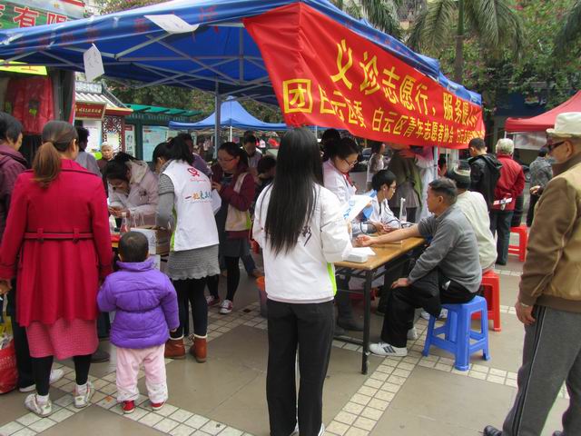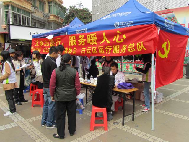 太阳在云层后微露,风中带着冬日早晨的清寒, 2011年12月17日,在yl23455永利官网2006七年制党支部、团支部“义诊志愿行服务暖人心”义诊活动在景泰文化广场如火如荼地展开。义诊活动的内容有量血压、艾灸、拔火罐、推拿、贴耳穴及养生知识宣传,并安排了中医基本知识问答小游戏,在有趣的互动中让中医与健康知识自然深入群众之中。在院团委的支持下,邀请了广州中医药大学第一附属医院推拿科的陈维医师和内分泌科的方志辉医师“坐镇”,为居民们解疑答惑、义诊治疗。