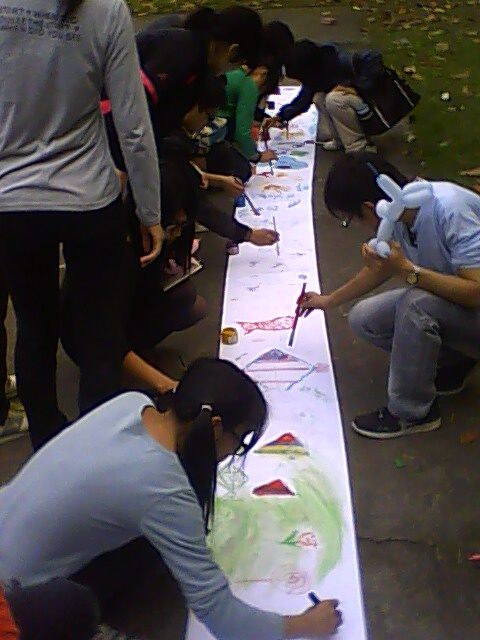 其三,百米挥毫。一张长长的白纸上,我们能留下什么?没错,就是五彩斑斓的色彩,它代表着精彩的生活瞬间,我们绘画着,我们书写着……另外,我们特地将全班同学的艺术签名组成一个团徽,代表着我们,我们的团,幸福快乐地走在青春的道路上。