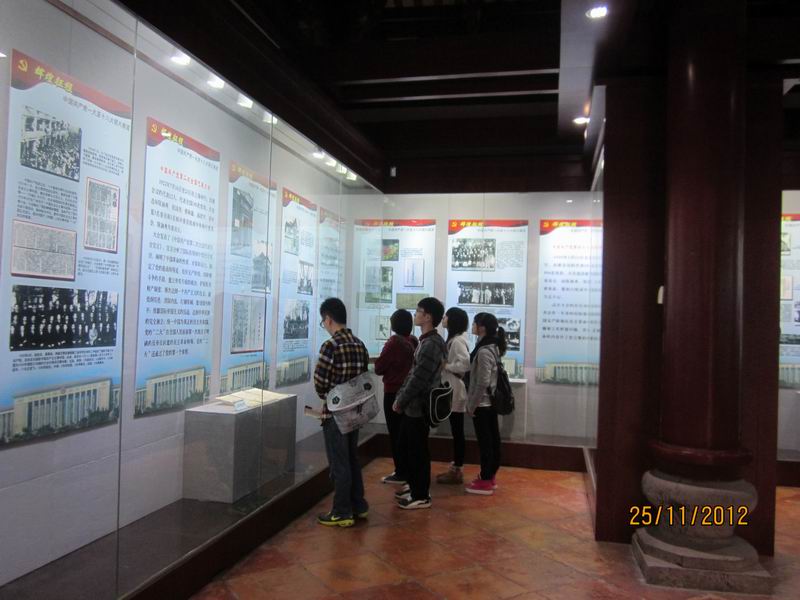 首先我们来到正对大门而开的“中共一大到十八大图片展”。在这里,大家可以看到中国共产党从成立到现在所走过的心路历程。这一路走来,累累的硕果中不知包含了多少代人的艰辛,又有多少代人的付出!感慨之余,有一位同志轻声细语地问道:“我们党的全国代表大会是几年召开一次的啊?怎么这里的时间这么没有规律的?”就在一呼一吸间,另一名同志就接着回答:“现在我们应该是五年一次,只不过党开始成立之初正值国势混乱之时,所以召开的时间没有什么规律性,不过也能从中看到其中的规律。”紧接着,又一名同志补充道:“等我们看完十八次当全国代表大会的介绍,就能看出个所以然啦!”俏皮的话音一落,大家就乐呵呵地回归到他们的“寻访”之路。