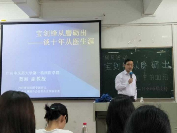 “飘零琴剑下巴东,蓬山未必路不通。”学医路漫漫,一个从医学生到医生需要的时间远不止五年。蓝海老师在广中医读完本科后,开始了在医院当“合同工”的生涯,他认为人生不应该如此平庸,于是他把握各种学习机会提升自己,最后成为我院开展自体干细胞治疗技术的骨干。他鼓励各位同学要坚定学医信念,因为医学之路虽然漫长,但是能够给人提供阶梯式的进步,在将来一定能有所作为。