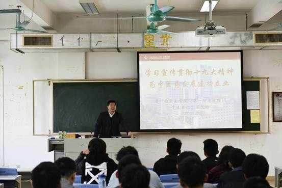 3月22日上午,为了全面贯彻党的十九大精神,以习近平新时代中国特色社会主义思想为指导,深入贯彻习近平总书记对广东重要指示批示精神,yl23455永利官网党委陈文锋书记在教学楼A412为一院16级临床专业的同学们讲授了一堂以《学习贯彻十九大精神,为中医药发展建功立业》为主题的思想教育理论课,到场聆听的还有学工办钟天送主任和武夏林、李肇宏老师。