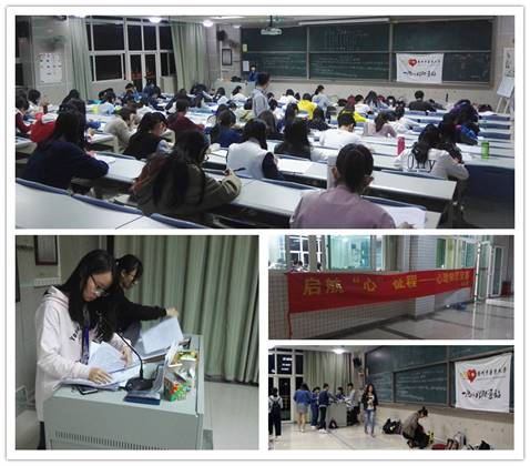 本次心理知识竞赛初赛分为三个环节,报名与准备、竞赛、改卷与公布结果。据了解,本次心理知识竞赛自3月1日开放报名2天内,报名人数即突破500,截至最后一天,总报名人数731人,同学们的参赛热情可谓相当高涨。3月23日晚7点,监考人员准时分发试卷,参赛同学开启了竞赛之旅,或埋头填写,或认真读题陷入思考,或许他们思考的不仅仅是对试题的理解,更重要的是从试题获得对自身、他人以及生活的思考。据了解,为了使测试过程有序进行,主办方在考试现场配备了每个考场两名监考人员,共16名,巡考人员2名,并于赛前对监考人员进行了考试纪律、监考注意事项等的培训。在同学们的配合和工作人员的努力下,本次心理知识竞赛初赛的现场测试顺利结束,同学们脸上都露出愉悦的表情,因为对参赛选手而言无论成绩如何,从试题中获得感悟是最重要的。3月25日晚7点到9点,由“五心盟”组成的改卷小组于教学楼A301开展阅卷录分工作,改卷小组共16人,分为8组,每个小组的同学轮流进行初次阅卷和复审,以保证阅卷工作的准确无误。阅卷完毕,由4名同学组成的录分小组开始紧张有序的分数录入。随着阅卷现场笔的批改声和键盘的敲打声渐渐停止,本次心理知识竞赛初赛也完美地落下了帷幕,比赛结果也顺利出炉。据悉,为增加校际间的交流与合作,本次初赛的前3名选手将被选送参加高校间的心理知识竞赛的复赛与决赛。