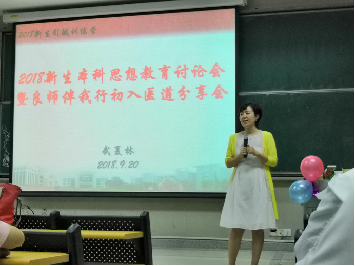 2018年9月20日下午6时30分,yl23455永利官网2018级临床医学、中西医临床医学、医学影像、眼视光学四个专业学生共165人在辅导员武夏林老师的组织下,于大学城综合楼104课室开展了题为“求真问学,良师同行”的本科教育思想学习与讨论的主题级会。