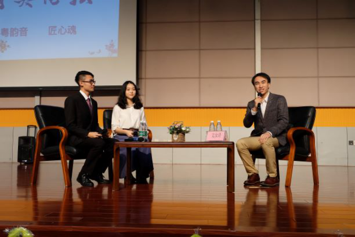主持人与嘉宾访谈告一段落,接下来是互动环节。文汝清老师为大家演示了粤剧的靶子功,四位同学上台模仿学习。在现场问答中,同学们踊跃提问,甚至对粤剧发展、中医药与粤剧结合提出创新建议。文汝清老师表示,随着个人和社会发展,他的目标逐渐变化。从成为主角得到关注,到渴望剧院有多层次的观众,现在,他用普及粤剧知识搭建桥梁,引导更多人走进剧场享受文化盛宴——这是传承传统文化的责任与使命。