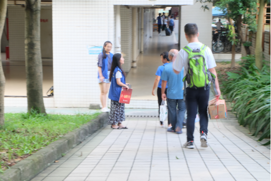 很快,新生们就陆陆续续来了。一路上有蓝色小马甲将人生地不熟的新生们带领到一院大本营报道、领取自己的校园卡。学生会还为新生准备了一院大礼包,一个精美的帆布袋包,不仅有特别的纪念意义,里面还有多种多样的开学必备物品。迎新工作有条不紊地展开,一院志愿者各司其职、认真负责地进行着自己的任务。在大本营的工作人员给新生派发校园卡和相关资料,并热心地解答新生的问题;分布在校园的志愿者引导学生家长去往大本营,还热心地帮忙搬运行李,尽可能的提高新生们的注册效率。随后大学党委书记张建华等学校领导以及职能部门领导来到一院大本营视察迎新工作,学工办钟天送主任、新生辅导员李平和邱敏老师们也在大本营内认真指导迎新工作,并耐心地解答学生家长提出的疑问。