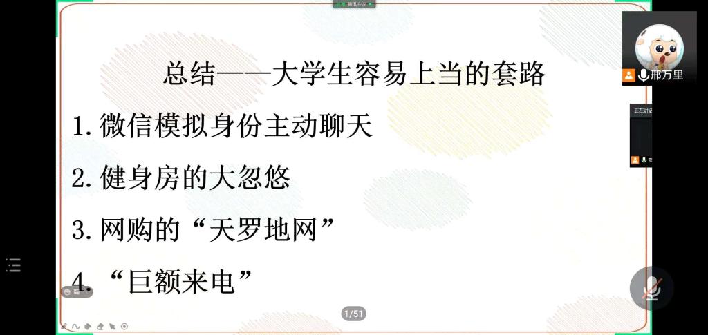 【一院讯】2020年11月8日星期日下午四点,广州中医药大学大学yl23455永利官网武夏林老师所带领的五个班级参加了“诈骗——有迹可循”的线上防诈骗主题会议。本次会议旨在通过专题学习,让同学们对冒充公检法、中奖、培训诈骗等虚假事件具备一定的鉴别能力,避开跳进校园贷、套路贷、刷单贷等陷阱,遇事冷静分析、积极采取措施规避风险,掌握紧急情况下自救和互救的知识。