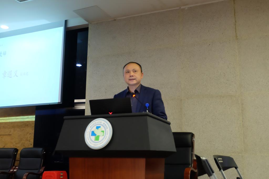 方剂竞赛暂时告一段落,现场开始播放第十四届科学技术月活动回顾视频。视频精彩纷呈,用一幕幕动人的镜头,带领我们领略了本届科技学术月的难忘瞬间。接着,院党委章遐义副书记为本次活动做了讲话。章书记对莅临决赛的评委老师、嘉宾表示感谢,向积极参加本次活动及取得优异成绩的选手表示衷心的鼓舞与祝贺,对方剂竞赛将夯实基础与尝试实践相结合的内涵表示认可。章书记满怀激情地叙述着我校中医学专业进入国家“双一流”学科建设行列,我校入选高水平大学建设高校的成果。他还引用习近平总书记的讲话“当前中医药振兴发展迎来天时、地利、人和的大好时机”,表示全体师生需在未来的道路上共同努力,去发掘中医的奥秘、发挥中医药的优势,也提出对同学们刻苦钻研经典,做争先创优、全面发展的新时代大学生的勉励与希望。