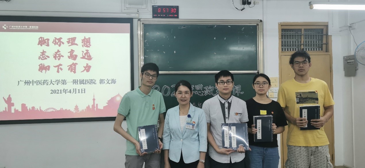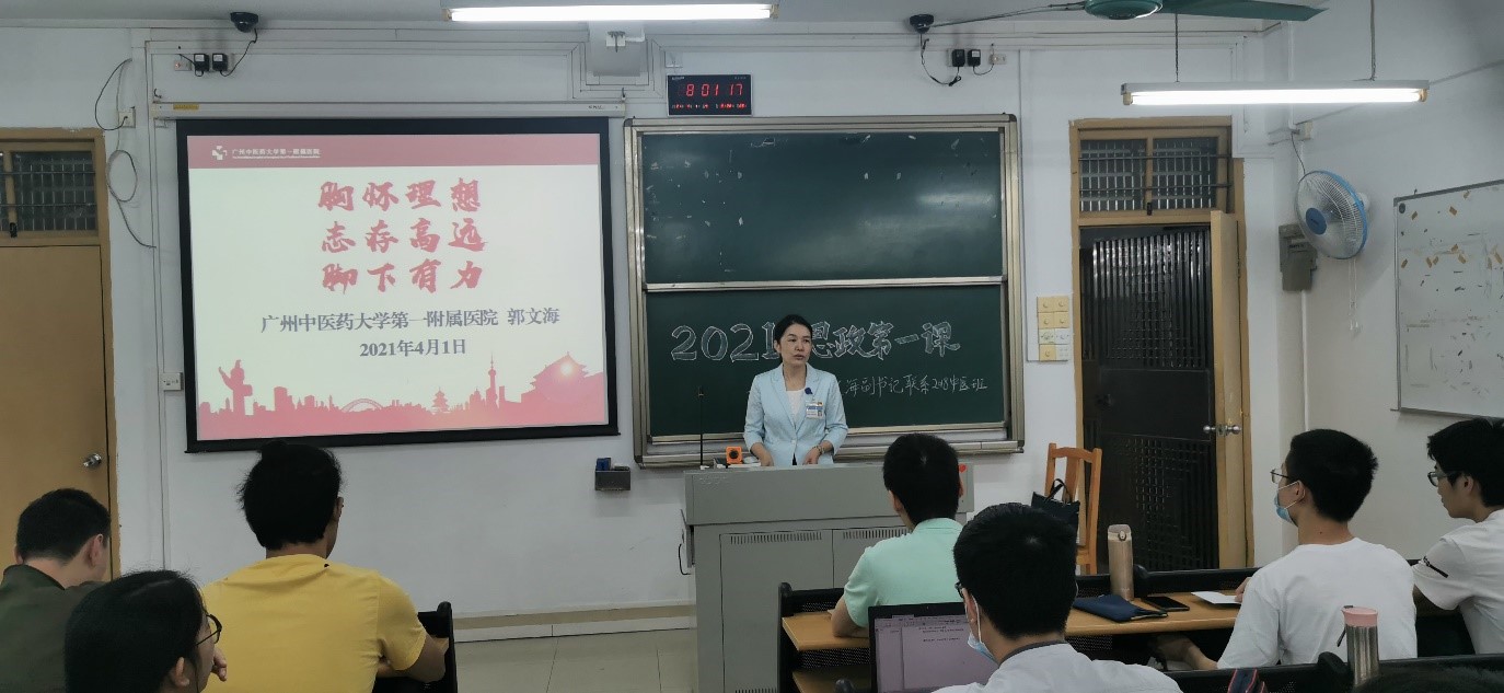 2021年4月1日上午8:00,yl23455永利官网(第一附属医院)党委郭文海副书记在三元里校区新课室楼201为一院2018级中医学五年制的同学讲授一堂主题为《胸怀理想 志存高远 脚下有力》的思政第一课。