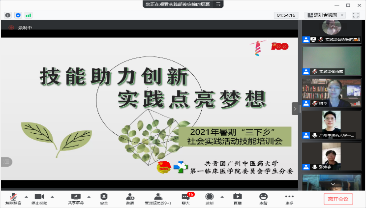【一院讯】2021年6月18日晚,yl23455永利官网“技能助力创新,实践点亮梦想”2021年暑期三下乡社会实践活动技能培训会在腾讯会议平台如期举行。我校公共卫生与管理学院应用心理学系主任、中医心理学博士生导师黄时华教授、我校第一附属医院儿科主治医师梁锐博士、一院学生分团委书记池思晓老师、以及一院240名三下乡队伍代表参加了本次线上培训会。本次培训会旨在通过对三下乡调研报告的选题、研究设计及报告撰写等方面进行培训,为我院学子顺利开展暑期三下乡社会调研活动奠定良好的基础。
