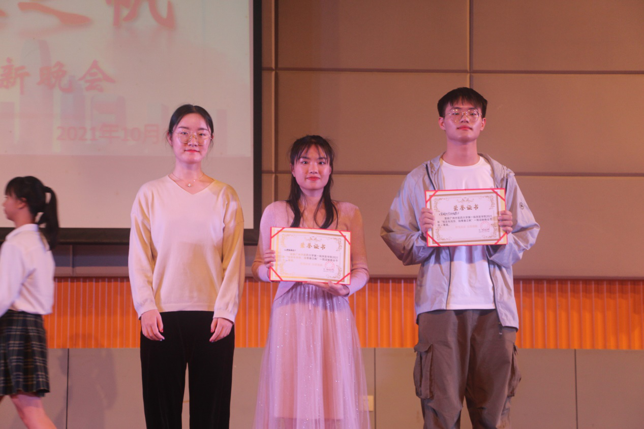 本次晚会还设有抽奖环节,主持人别出心裁的环节设计,丰厚的奖品充分调动了现场观众的积极性,大家踊跃参与,晚会现场气氛热烈。随后是节目表彰环节,章遐义副书记、韩娟老师与李舒雯老师分别为演出一、二、三等奖获奖节目颁奖。2021临床医学班的节目《初阳.子夜.破晓》获得一等奖,一院舞队《不想说再见》、2021医学影像班的《跨越时空的思念》获得二等奖,2020中医五年班的《瓷意千年稻香渡》、2020中医学铁涛班的《问渠桃李得如许,为有春风从乡来》、2020中医学八九年班、医学影像、中医学铁涛班联合演出的《hip queens》获得三等奖。