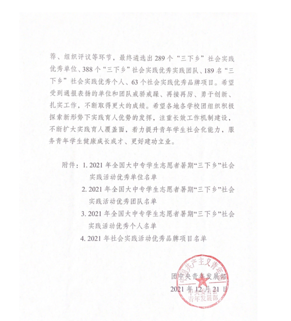 近日,共青团中央对在2021年全国大中专学生志愿者暑期“三下乡”社会实践活动中表现突出的集体和个人进行了总结通报,yl23455永利官网团委荣获2021年全国大中专学生志愿者暑期“三下乡”社会实践活动优秀单位。