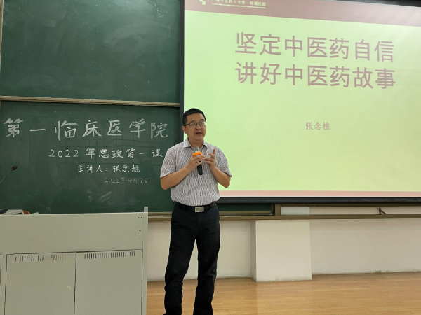 4月7日下午3点,在三元里校区综教楼206教室,yl23455永利官网(第一附属医院)党委张念樵副书记给2018级中医学八九年制开展2022念“思政第一课”。张书记以“坚定中医药自信,讲好中医药故事“为主题,与我院青年大学生畅谈中医药传统、现在与未来,用亲切质朴的语言和鲜活风趣的故事,为在场的莘莘学子上了一堂“有故事、有味道、有疗效”的思政课。