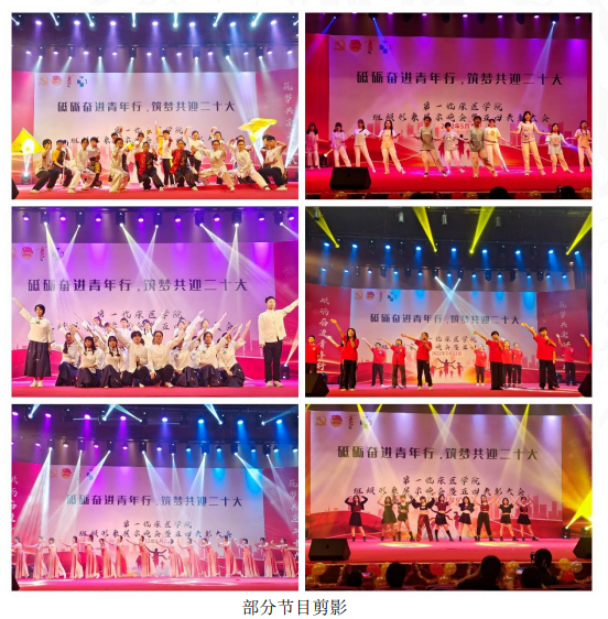接着,晚会进入正式表演环节。我院学子带来的节目精彩纷呈,彰显了新时代青年朝气蓬勃的青春风采和精神面貌。一院武术协会带来的《群英璀璨》以踢、打、摔、拿等多种技击方法,展现了青年人独有的朝气和热血;云梦艺术团舞蹈队用现代舞《木棉盛》舞出了新时代青年青春活力的样貌与坚韧不拔的精神;21中五团支部以一首《错位时空》带领我们重温历史、致敬先辈,唱出了穿越时空依旧熠熠生辉的伟大精神;21影像团支部的《党的好少年》、20中五团支部的《青年志》、20影像团支部的《少年中国说》等节目诠释了青年一代的理想信念与使命担当,感召家国情怀,鼓舞吾辈青年以青春之姿,担青年之责;20铁涛团支部的《青春时代》以合唱和朗诵结合的方式,展现了有志青年无畏挫折,砥砺奋进,用前进的脚步丈量未来的征途,用奋斗的汗水书写新时代绚丽篇章的坚定信念!