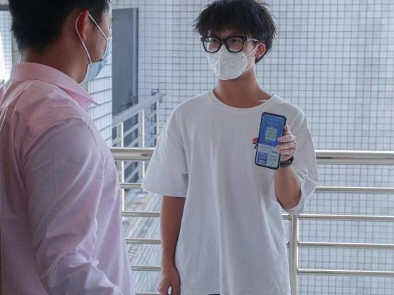 (工作人员检查与会人员的健康码)