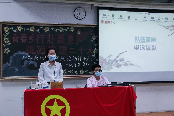 在播放我院精彩的年度“三下乡”总结视频后,主持人宣布评比大会正式开始,并向观众介绍评比规则。各队伍以幻灯片、视频等形式展示了各自的实践成果,其中不仅有基础医疗志愿服务、义教、调研等传统的暑期社会实践内容,还有讲好中医药故事、宣讲铁涛红色故事、探访老党员、参观著名红色景点等特色活动。这些活动不仅让中医药文化走进群众、让党史教育课程深入人心,更激励着一院学子成为堪当民族复兴重任的新时代青年。各队伍的实践成果展示各有千秋,在每支队伍在展示结束后便进入答辩环节,面对评审团的现场提问,队伍答辩者随机应变,围绕下乡的实际情况进行回答,展示了我院青年朝气蓬勃的面貌。