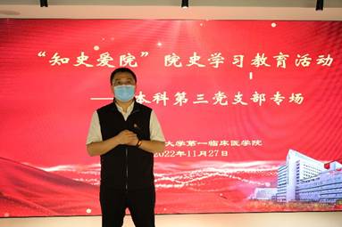 【一院讯】为了强化我院学生对院史情况的了解,提高我院学生医学使命感,11月27日11时,我院党委书记李强同志带领所负责联系的第三党支部成员在三元里校区综教楼10楼院史馆举办“知史爱院”院史学习教育活动,我院党委副书记章遐义、党办、院办、教学处等部门相关负责人一同参加此次活动。