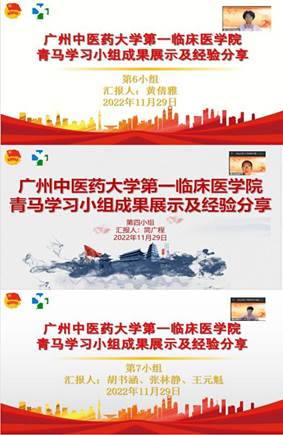 在党的二十大胜利召开后,一院青马学员在团委的组织下开展了党的二十大精神小组学习会,并通过手抄报、视频等方式创作凝练了学习的成果,以实际行动深入贯彻学习党的二十大精神。本次会议邀请了青马学习小组中的三组代表进行了学习经验及成果分享。三个小组代表总结出了在组织学习活动中可借鉴的经验,一是要确立目标,二是要细化工作,分工到人,三是要秉持自愿选择、发挥自己所长的原则规划分工,还以图片、视频等形式向与会人员展示了所在小组的学习成果。
