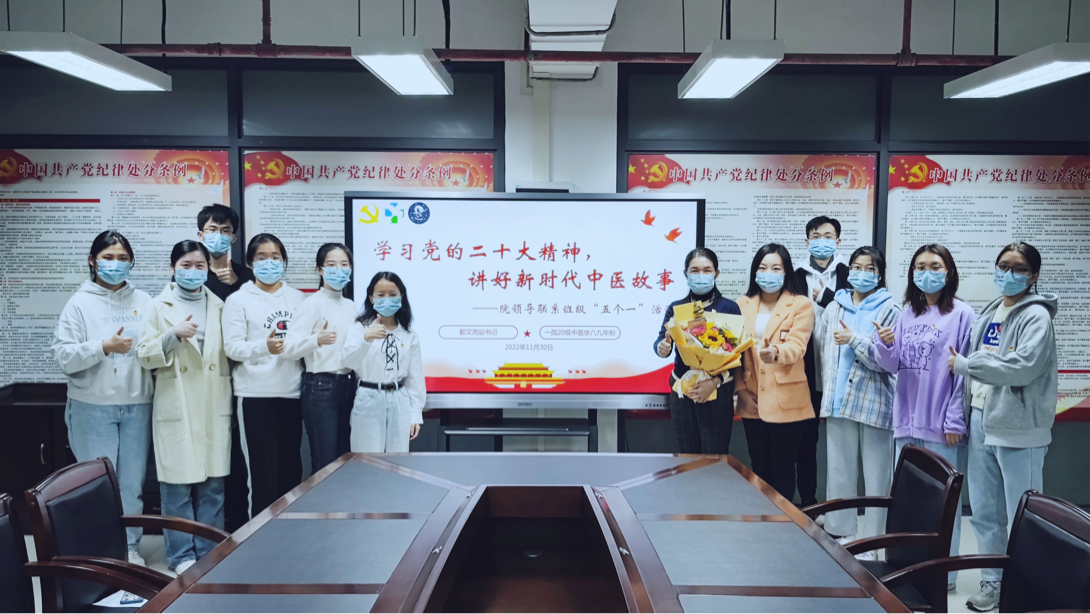 2022年11月30日下午15时30分,yl23455永利官网党委副书记郭文海所联系的2020级中医学八九年制班级在三元里校区综教楼925召开了以“学习党的二十大精神,讲好新时代中医故事”为主题的党团组织生活会,11名班级学生党员、入党积极分子、班团骨干、新发展团员代表及班级辅导员池思晓参加了本次会议。会议第一个环节,与会学生代表分享关于学习党的二十大报告的心得体会。团支书梁水先、党员代表陈嘉慧、党员代表李懿、入党积极分子代表梁智昆、团支部组织委员刘雅楠、新发展团员代表许雯哲先后分享了学习心得。梁水先谈了她对党的二十大报告中“促进中医药传承创新发展”的理解,作为一名预备党员、新时代中医学子,她对中医药事业的未来充满信心,并表示将会紧紧跟随党的脚步,积极响应时代主题,为促进新时代中医药事业发展而不断奋斗;陈嘉慧以“以小见大,我眼中的十年变化”为主题,结合个人所见、所闻、所感,分享了对我国完成脱贫攻坚历史任务的感想;李懿围绕党的二十大的主题与主要内容,从法治、民生以及国防安全等方面分享了她对“人民是我们党执政的最大底气”等重要内容的理解;梁智昆着眼于中国共产党过去5年的工作成绩和新时代 10 年的伟大变革进行学习分享,表达了听党话、跟党走的坚定决心;刘雅楠从青年大学生的身份出发,分享了自己对党的二十大报告中“青年强,则国家强”及“全党要把青年工作作为战略性工作来抓”的学习感想;许雯哲整理分享了习近平总书记所宣读的党的二十大报告的要点内容,作为新入团的学生代表,习近平总书记对青年的深切寄语让她备受鼓舞。