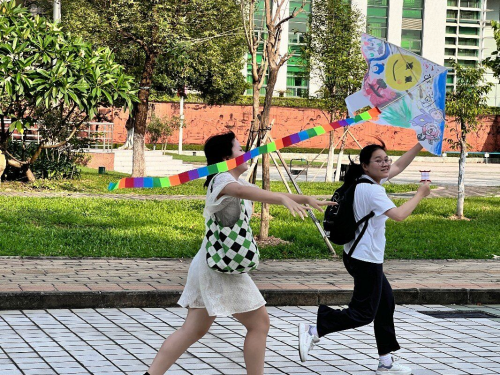 红线凌空去,青云有路通。风筝制作完成后,同学们在工作人员的带领下来到了升旗广场。随着一牵一松,一只只风筝拖着色彩斑斓的尾巴,乘着风晃晃悠悠飞向蓝天。同学们托着风筝肆意奔跑,长大后的杏林医者梦,融进了儿时的东风纸鸢梦。此刻,中医药文化不仅是我们在课堂上所学的知识,更是我们进行风筝创作的灵感源泉;而飞向天边的风筝,更倾注了我们立志将中医药文化发扬光大的美好愿望。