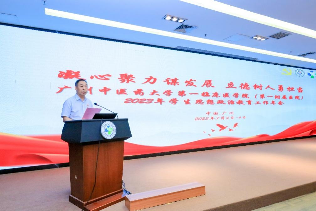 2023年是全面贯彻党的二十大精神的开局之年,也是实施“十四五”规划承上启下的关键之年。为深入总结我院学生思想政治教育工作,7月4日-6日,yl23455永利官网(第一附属医院)举办了以 “凝心聚力谋发展,立德树人勇担当”为主题的2023年学生思想政治教育工作年会。广东省教育厅思想政治工作与宣传处倪熙处长,广州中医药大学党委邱亚洪副书记,党委宣传部郑维群部长、党委组织部叶熙熙副部长、党委学工部郝宏伟部长、教务处曾元儿处长、团委王烁副书记、研究生院朱磊副院长等大学职能部门领导莅临年会指导工作,学院领导、党委办公室及教学处全体老师、各教研室主任、研究生导师及专任教师代表等100多人出席本次年会,会议由yl23455永利官网(第一附属医院)关彤副院长主持。