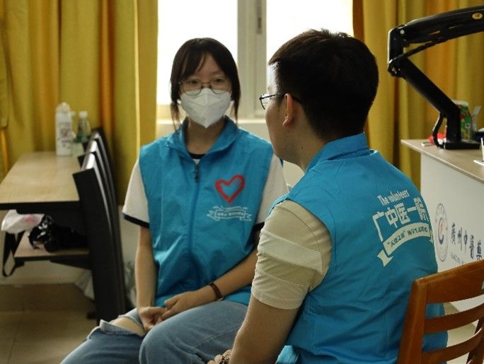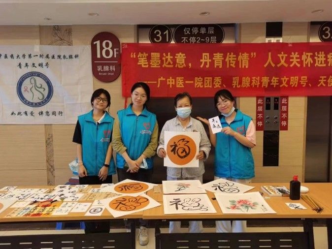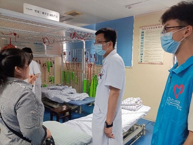 7月17日下午,在经历了干货满满的岗前培训后,第一期志愿者们满怀期待与热情前往我院肿瘤中心、乳腺科、脊柱骨科、创伤骨科、肾病科血透室、针康中心一区、二区等7个临床科室,开始投入到暑期医学人文与志愿服务的实践中。乳腺科里,志愿者们为患者们精心策划了“笔墨达意,丹青传情”主题活动;针康中心一区,志愿者们在病房里观看了针灸治疗的过程,与病区患者交流,倾听他们的心声;针康中心二区,志愿者们与病区患者亲切交流,细心温暖的陪伴让患者们敞开心扉,病痛带来的忧愁一扫而光;肾病科里,志愿者们通过了解患者的病情与治疗过程,深度共情血透患者所经历的苦难,为后续志愿服务的开展提供了更深的思考;肿瘤中心,志愿者们在陈尧老师的带领下实地参观肿瘤中心医学人文病房的建设成果,在余玲老师的小讲课中了解什么是叙事医学;创伤骨科里,志愿者们聆听了一场兼具学术性与趣味性的病例教学与分析,随后深入病房学习与患者有效沟通的技巧;脊柱骨科里,志愿者们跟随科室医生查房后积极探讨如何为患者制作一份有故事的纪念礼物。一个个真诚的笑容,一声声热情的问候,一句句暖心的关切,“天使之翼”志愿者们给病房带来了不一样的生机活力、不一样的温度。 “蓝马甲”点缀在我院的各个角落,形成一道亮丽的风景线。